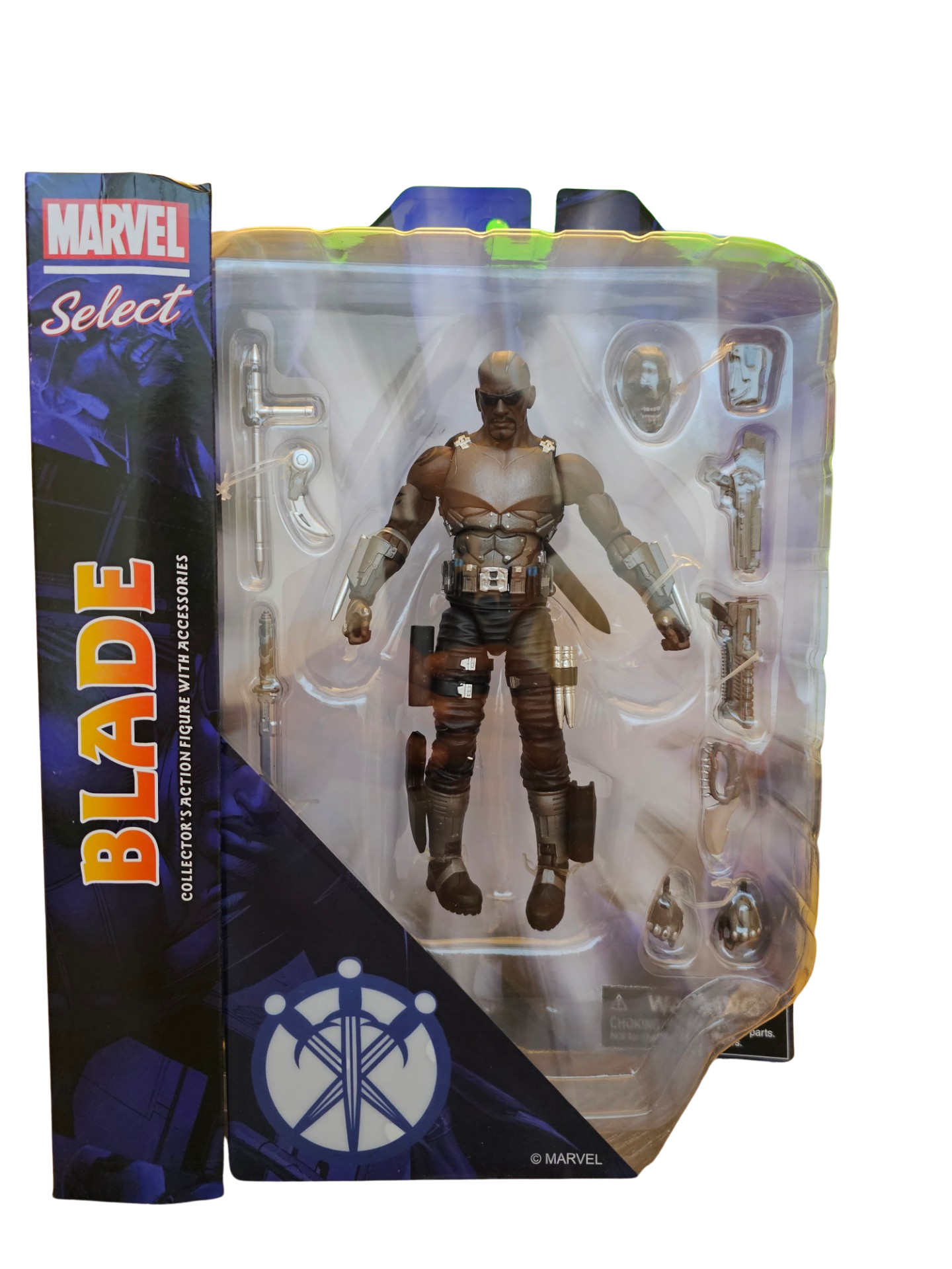 Vampires beware! The fearless vampire hunter Blade has arrived in the Marvel Select action figure line, and he is ready for war! Equipped with an arsenal of weapons, including sword, guns, stakes and more, the Daywalker also includes interchangeable normal and vamped-out heads. Standing approximately 7-inches tall, this collector-edition action figure features 16 points of articulation and comes in display-ready Select action figure packaging, with side panel artwork for shelf reference. Ages 8and up.